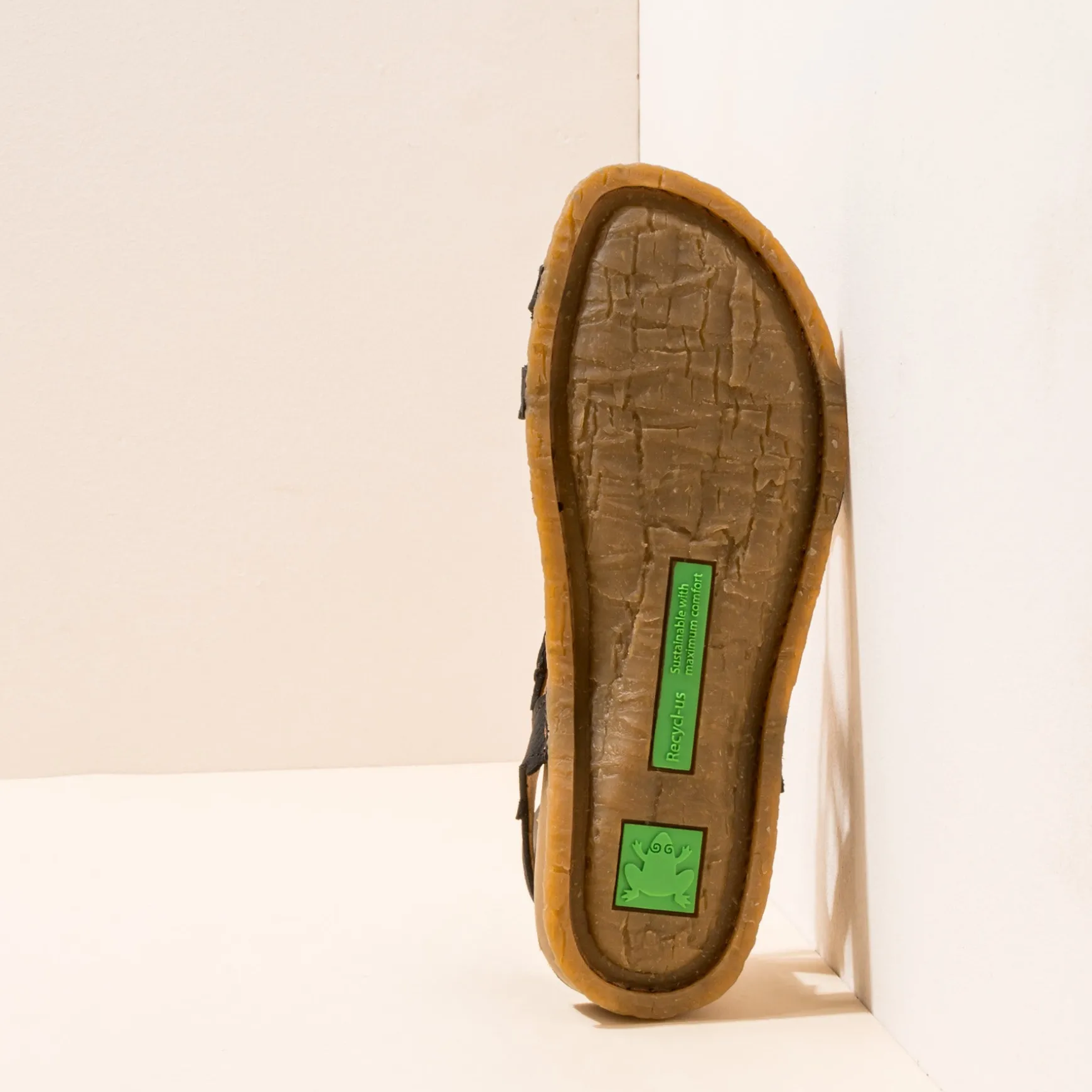 Sandalia Que Unifica Suela De Caucho Reciclado Y Plantilla En Una Sola Pieza Reduciendo Asi Un Componente Y Facilitando Su Reciclaje. El Diseno De La Suela Esta Inspirado En El Tronco De Las Palmeras De La Isla Panglao De Filipinas. Esta Linea Destaca Por Su Flexibilidad. En Su Interior Tiene Alojado Un Memory Foam Reciclado Que Aporta Un Extra De Confort.